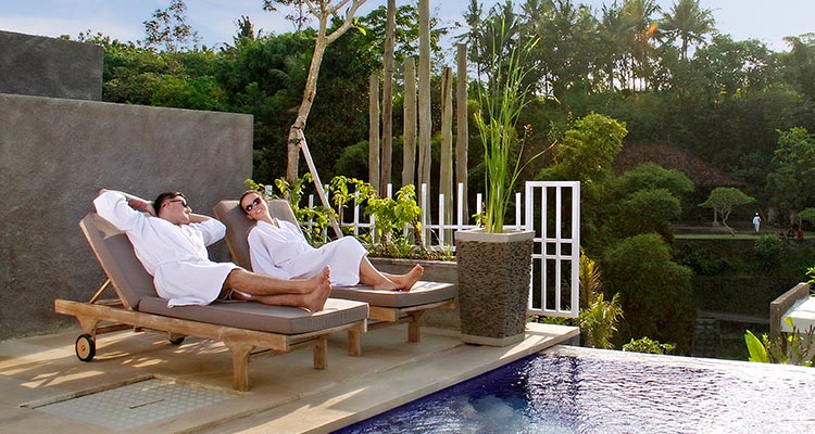 It is situated a short ride southwest of Ubud in a river valley overlooking a lush tropical forest with all shades of green. Frangipani, eucalyptus all sorts of tropical vegetation grow bountiful around the villa complex. On the opposite side of the compound in between palm trees, there is a little temple where locals come to bring offerings to their Gods or perform ritual washings. Watching this scenery from the private pool feels as though you take a travel through time and space to where Adam and Eve might have spent their days.